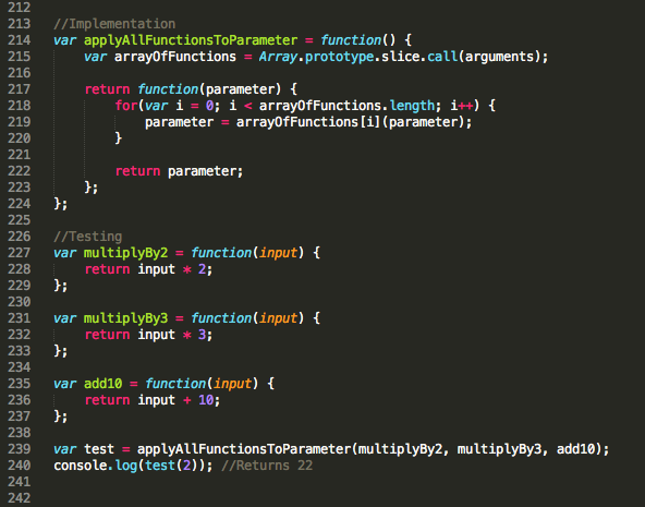 Once this concept of scoping is understood, we may craft considerably more clever functions. In the example below, we take in some unspecified number of functions as arguments. These functions are then saved and set to be applied to the variable parameter at some unspecified time in the future.